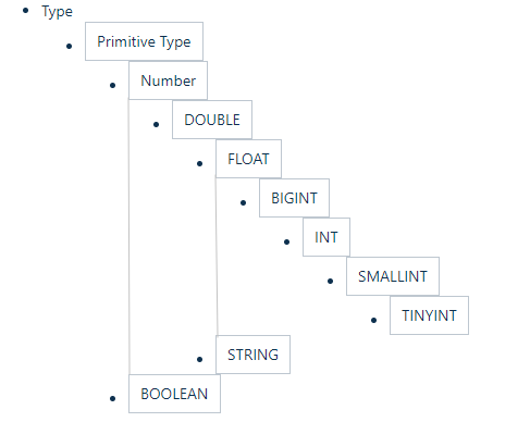 Hive 中基本数据类型遵循以下的层次结构,按照这个层次结构,子类型到祖先类型允许隐式转换。例如 INT 类型的数据允许隐式转换为 BIGINT 类型。额外注意的是:按照类型层次结构允许将 STRING 类型隐式转换为 DOUBLE 类型。