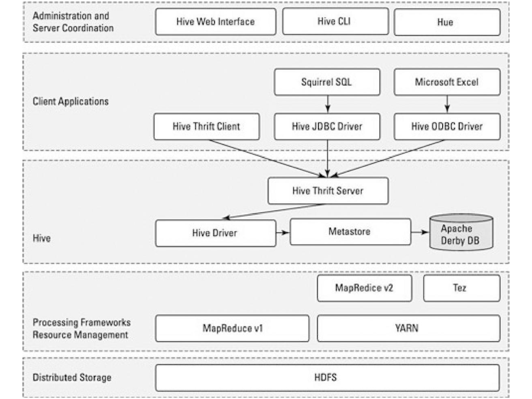 对应用支持的关键组件是Hive Thrift服务,它允许一个富客户端访问Hive,开源的SQuirreL SQL客户端被作为示例包含其中。任何与JDBC兼容的应用,都可以通过绑定的JDBC驱动访问Hive。与ODBC兼容的客户端,如Linux下典型的unixODBC和isql应用程序,可以从远程Linux客户端访问Hive。如果在客户端安装了相应的ODBC驱动,甚至可以从微软的Excel访问Hive。通过Thrift还可以用Java以外的程序语言,如PHP或Python访问Hive。就像JDBC、ODBC一样,Thrift客户端通过Thrift服务器访问Hive。
