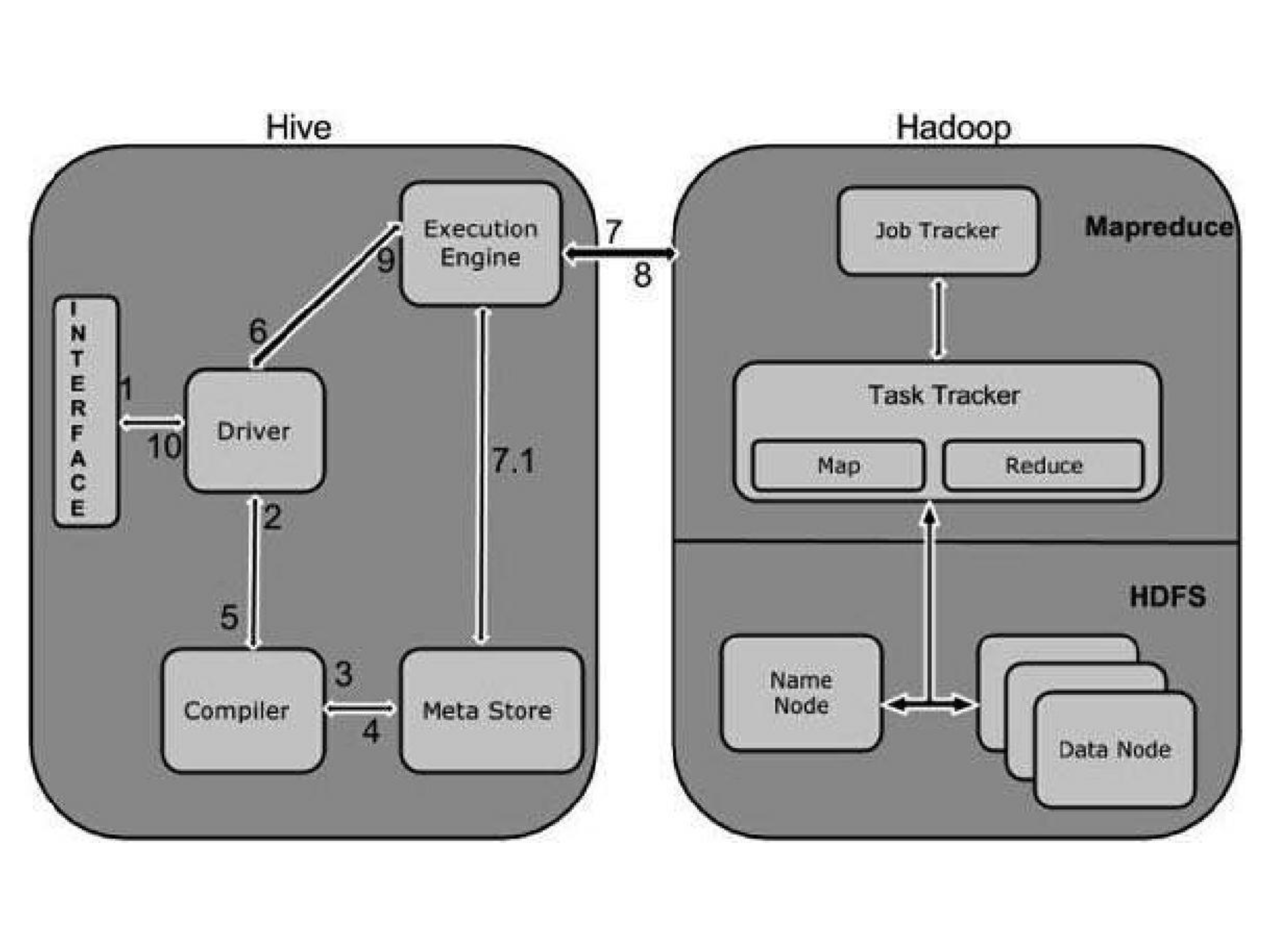 | 7.执行作业 | 执行计划的处理是一个MapReduce作业。执行引擎向Name node上的JobTracker进程发送作业,JobTracker把作业分配给Data node上的TaskTracker进程,此时,查询执行MapReduce作业 |