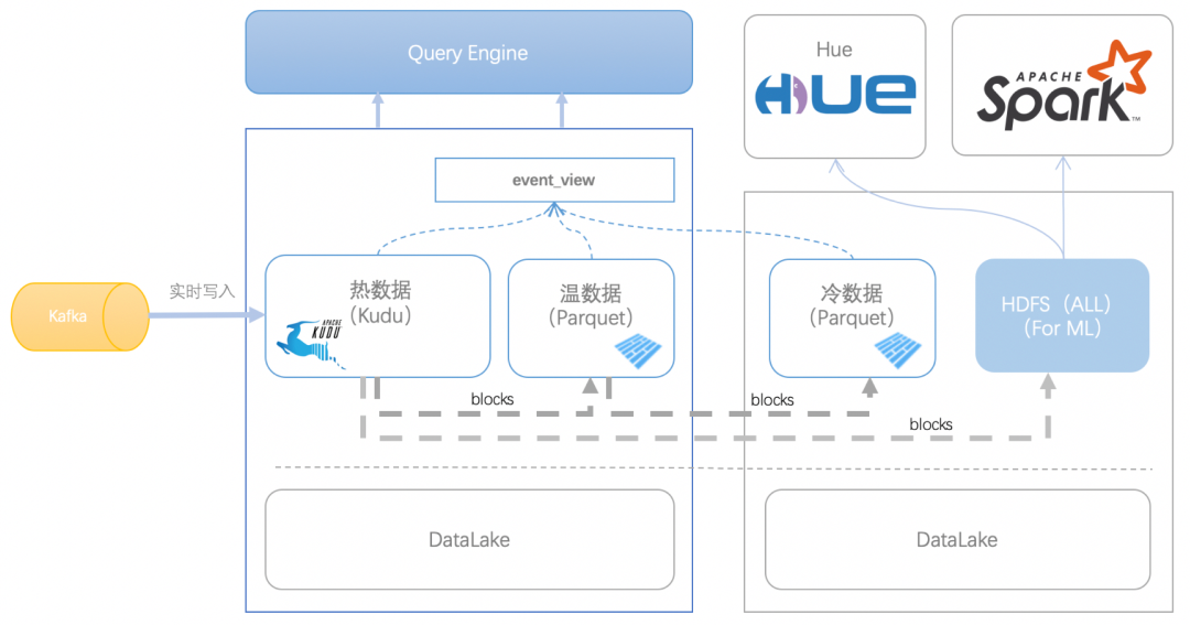 完全基于 Kudu 存储数据的话,一方面成本较高 (Kudu 集群都要基于 SSD 盘搭建才能有比较好的性能表现);另一方面在营销场景下更关注短时间段 (比如近一个月、三个月、半年等) 客户的实时行为变化,对于时间较久的历史数据使用频次很低。