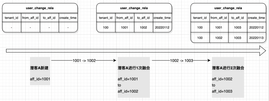 举个例子潜客发生两次融合 (affId=1001 先融合到 1002 上,再融合到 1003 上) 时的 user_change_rela 的数据变化情况,如下图: