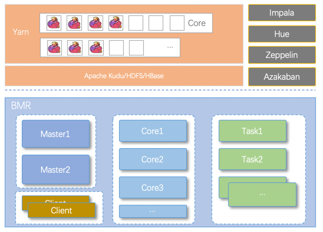 - Core 节点:计算及数据存储节点,部署 DataNode、NodeManager 等进程;