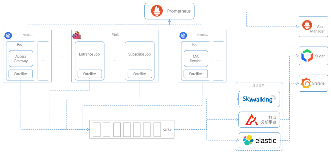 - 日志采集:基于爱番番贡献给 Skywalking 的 Satellite 收集全链路服务日志,支持了 K8s 下微服务的日志收集,也支持了 Flink Job 的日志采集,做到一个日志平台,汇集全链服务日志。然后通过 Grafana 进行日志查询、分析;