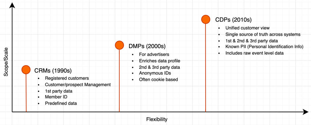 CDP (Customer Data Platform) 是近些年时兴的一个概念。随着时代发展、大环境变化,企业在自有媒体增多的同时,客户管理、营销变难,数据孤岛问题也愈发严重,为了更好的营销客户,CDP 诞生了。纵向来看,CDP 出现之前主要经历了两个阶段: