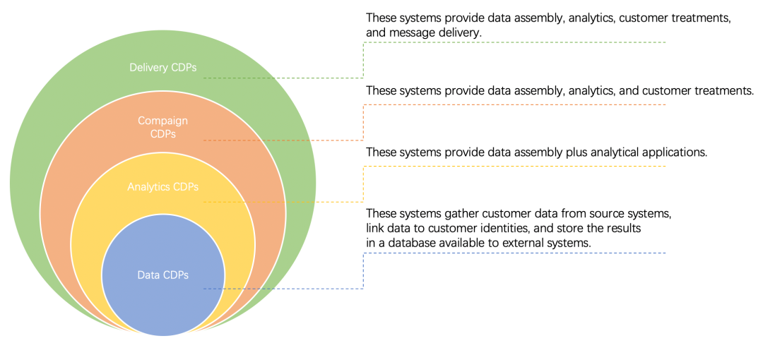 CDP 本身的 C (Customer) 是指 all customer-related functions, not just marketing。面向不同场景也对应不同类型的 CDP,不同类别的 CDP 主要是功能范围不同,但是类别之间是递进关系。