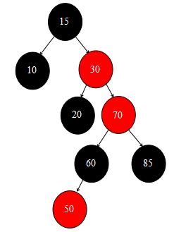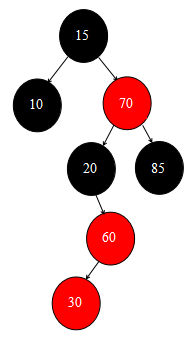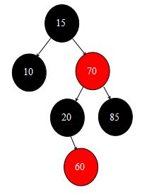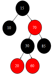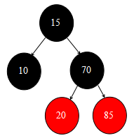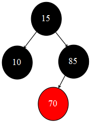 put(70, "70")就很简单了,70是85的左子节点,由于70的父节点以及叔父节点都是红色节点,因此直接将70的父节点85、将70的叔父节点10着色为黑色即可,70这个节点着色为红色,即满足红黑树的特性,插入70之后的结构图为: