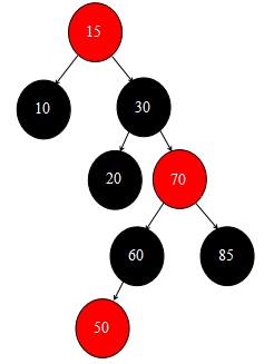 节点50的父节点与叔父节点都是红色节点(注意不要被上图迷糊了!上图是重新着色之后的结构而不是重新着色之前的结构,重新着色之前的结构为上上图),因此插入节点50只需要进行着色,本身这样的操作是没有任何问题的,但问题的关键在于,着色之后出现了连续的红色节点,即节点30与节点70。这就是为什么fixAfterInsertion方法的方法体是while循环的原因:
