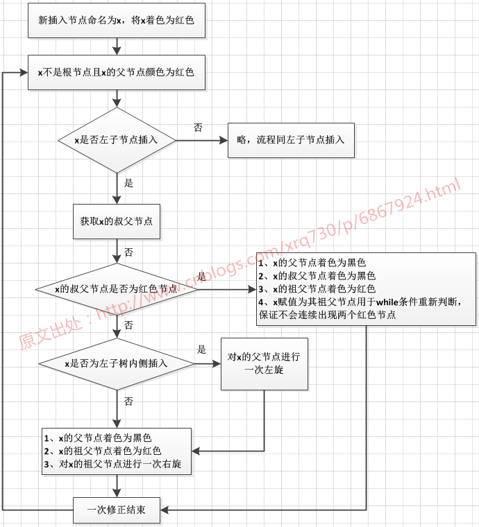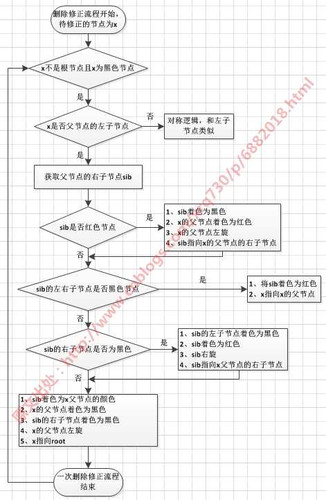 方法第3行~第30行与第30行~第57行是对称的,因此只分析一下前半部分也就是第3行~第30行的代码。第三行的代码**"x == leftOf(parentOf(x))"很显然判断的是x是否其父节点的左子节点**。其流程图为: