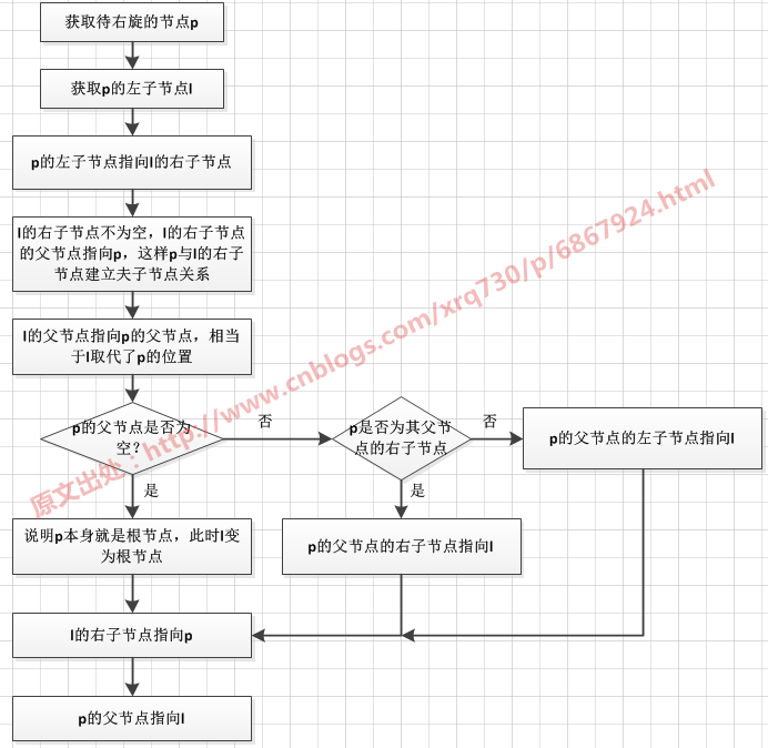 p指向右下角的黑色节点85,对此节点进行修正,上面的流程图是p是父节点的左子节点的流程,这里的p是父节点的右子节点,没太大区别。