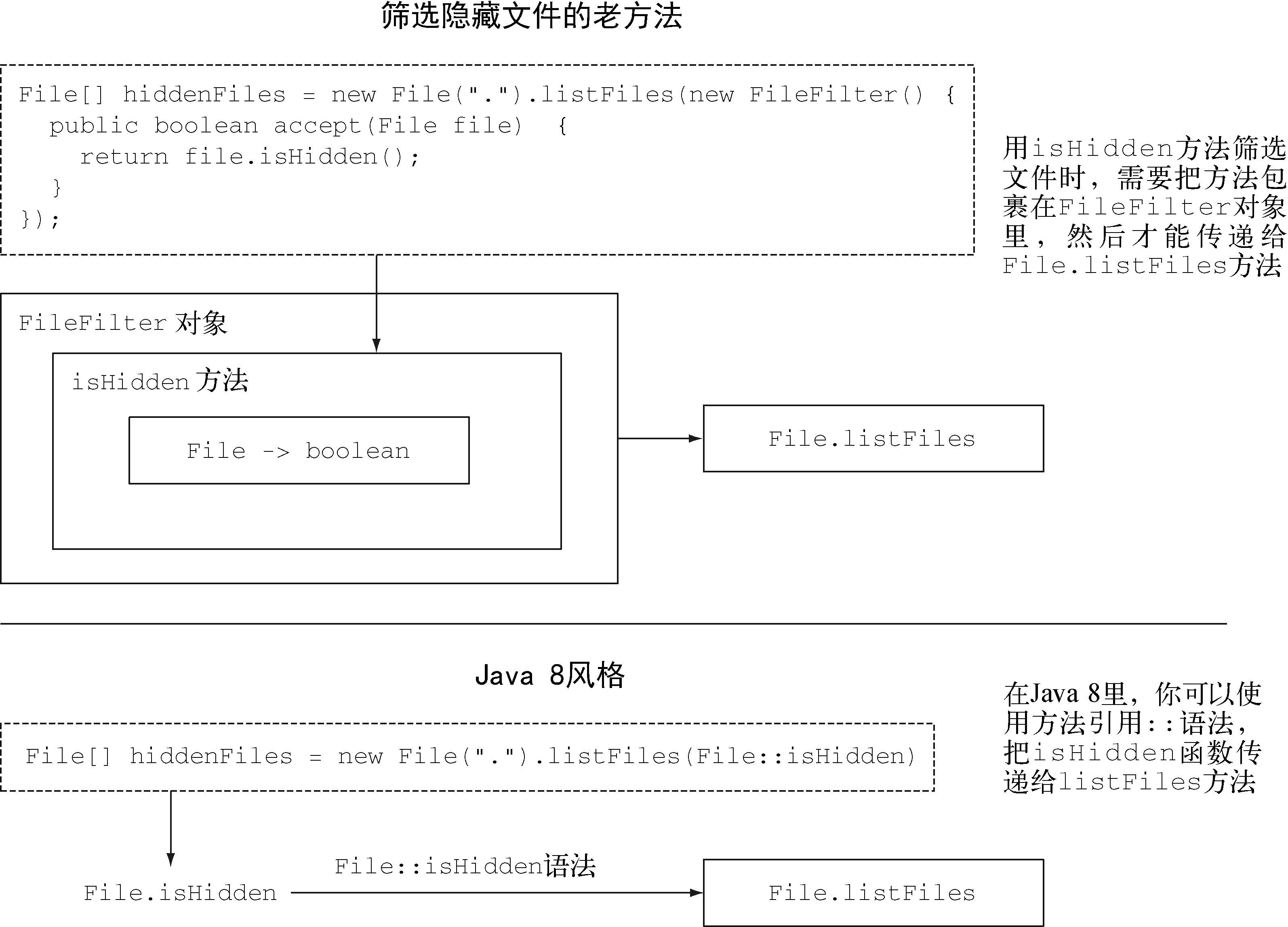 虽然只有三行,但这三行可真够绕的。我们第一次碰到的时候肯定都说过:“非得这样不可吗?”已经有一个方法isHidden可用,为什么非得把它包在一个啰唆的FileFilter类里面再实例化呢?因为在Java 8之前你必须这么做!如今在Java 8里,你可以把代码重写成这样: