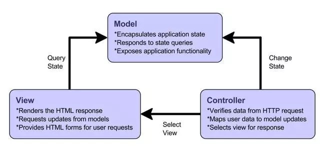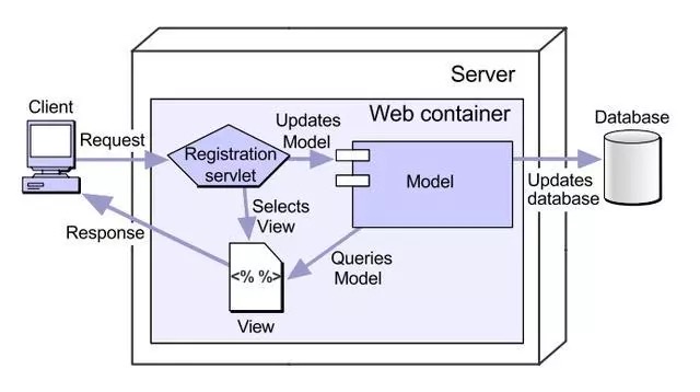 java web开发的技术体系还包括javabean和jsp,采用MVC结构来组合这三个技术是java web开发的基础内容,先看一下MVC的功能图: