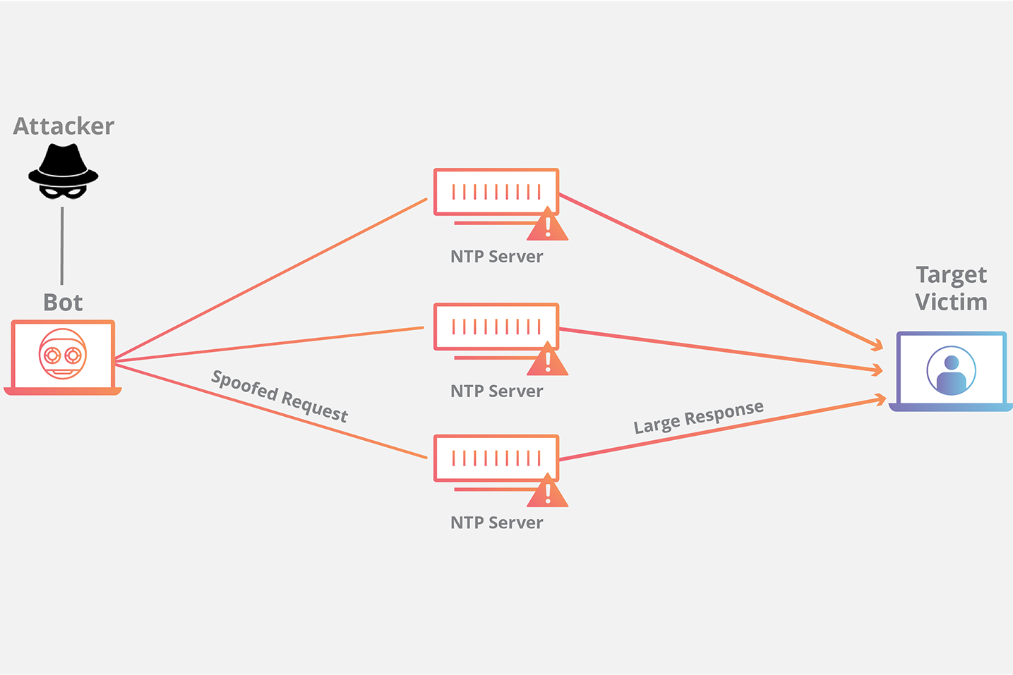 - 攻击者使用僵尸网络将带有伪造 IP 地址的 UDP 包发送到启用了 monlist 命令的 NTP 服务器。每个包的伪造 IP 地址都指向受害者的真实 IP 地址。